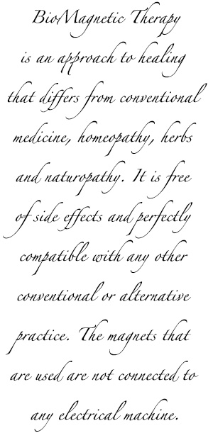 BioMagnetic therapy is a natural therapy that proposes re-establishing the normal internal cellular environment through the use of pairs of magnets of medium intensity that seek to equalize the organism’s pH level. The theory of biomagnetism has been developed by Mexican Dr Isaac Goiz, MD through his clinical work over more than 25 years. His theory observes that a wide range of illnesses and conditions are associated with fundamental alterations in the pH level of internal organs and with the presence of pathogens: viruses, bacteria, fungus, parasites, toxins, and other harmful factors. Bacteria and parasites tend to live and grow in an alkaline environment, while fungus and viruses tend to live and grow in an acidic environment. It is much more difficult for illnesses to develop in a cellular environment with a balanced or neutral pH level of 7.